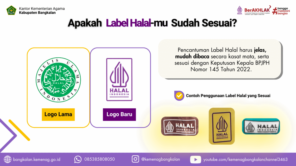 Setiap pelaku usaha yang produknya telah memiliki sertifikat halal wajib memasang label halal pada kemasannya. Adapun label halal yang wajib dicantumkan oleh pelaku usaha diatur dalam Keputusan Kepala Badan Penyelenggara Jaminan Produk Halal Nomor 88 Tahun 2023 tentang Perubahan atas Keputusan Kepala Badan Penyelenggara Jaminan Produk Halal Nomor 145 Tahun 2022 tentang Penggunaan Logo dan Label Halal pada Produk yang telah Memperoleh Sertifikat Halal. Bagaimana ketentuan label halal yang sesuai? Lalu bagaimana apabila saya masih memiliki kemasan dengan logo halal yang lama? Yuk, simak penjelasannya berikut.
